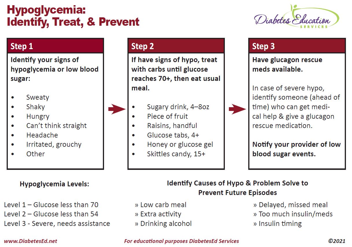 - Backside: This teaching tool provides step-wise instruction on how to identify, treat, and prevent hypoglycemia. It also describes the 3 levels of hypoglycemia and includes a list of factors that can increase the risk of hypoglycemia.